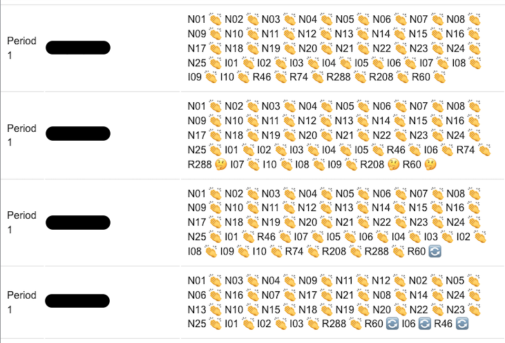 In addition to this, there was the matter of grading. I decided to make assignments for completing the newbie bites, intro bites, and some regular bites. This entailed heading back to the school admin dashboard and parsing the list of students again which looked like the figure below. Each row contains the class, the student name, and all of bites the student has at least attempted followed by an emoji that indicates whether the student had attempted (🔄), completed (👏), or looked at the solution (🤔). How do I know how many of which bites the student has completed? I had to count by hand. To make matters worse, these are listed in the order of attempt, not numerically. If a student went out of order (and trust me, they do) I had to slow down even more and make sure they weren’t missing any. Having my first experience to code being Automate the boring stuff and after watching Raymond Hettinger pound the table time and time again, I thought, there must be a better way.
