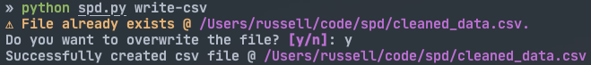The first command is write_csv (though when run on the command line Typer expects “write-csv”). It takes in a location (directory), a JSON file name (to read), and a CSV file name (to write). For both the json_path and csv_path objects I went with .resolve(). This is probably overkill, but it resolves symlinks, notation such as ~/path/to/location and ../location. As an added bonus, it works on both Windows and Linux/Unix platforms. The function then checks if there is an existing file at csv_path. If there is, it uses rich’s Confirm to prevent the user from accidentally overwriting the data. This is really convenient because I didn’t have to code any of the logic. It just works™. Then the actual conversion. Originally I converted the JSON to CSV using the built-in libraries and a for loop. But since I ended up using pandas later anyway, I went with that to convert it in just two lines code. Finally, it displays the success message. Here is a screenshot: