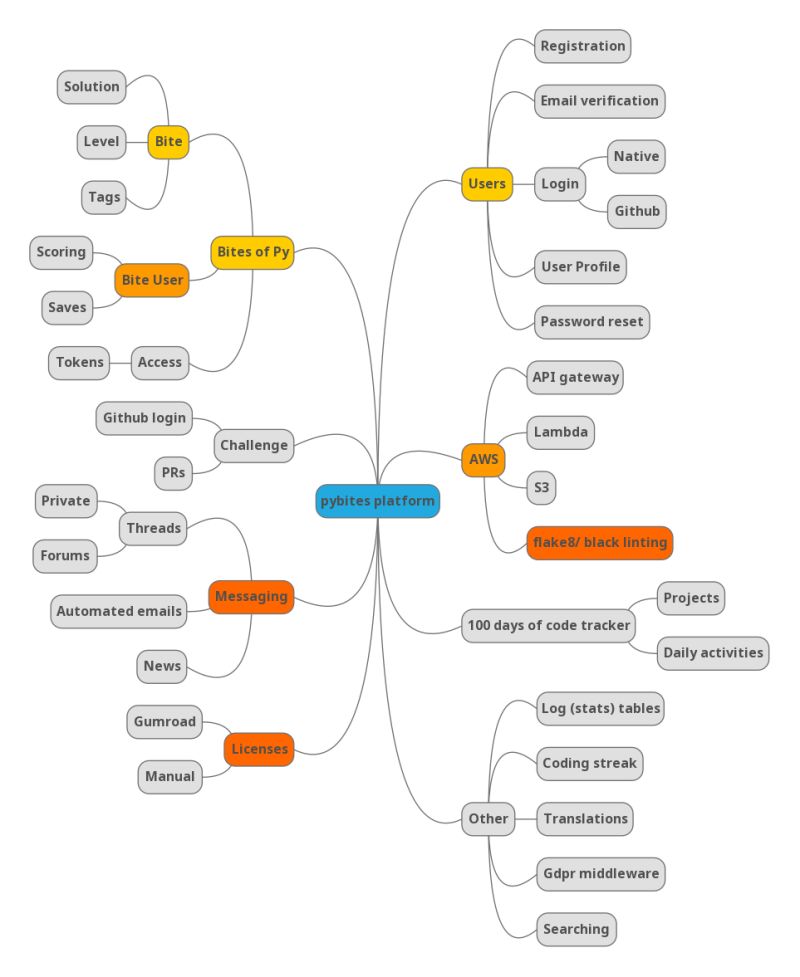 Get started here with our 11 minute Pybites Mindmapping (App Design) Training where we show you a practical mind mapping exercise for another Django site we maintain: Pybites Books
